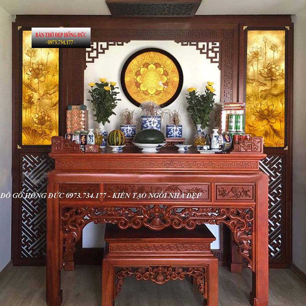 _ Bàn thờ làm bằng gỗ là phù hợp nhất hiện nay có nhiều loại gỗ tốt cũng như các loại gỗ thông thường để lựa chọn: gụ, hương, dổi, gõ đỏ, mít, cẩm vàng, sồi