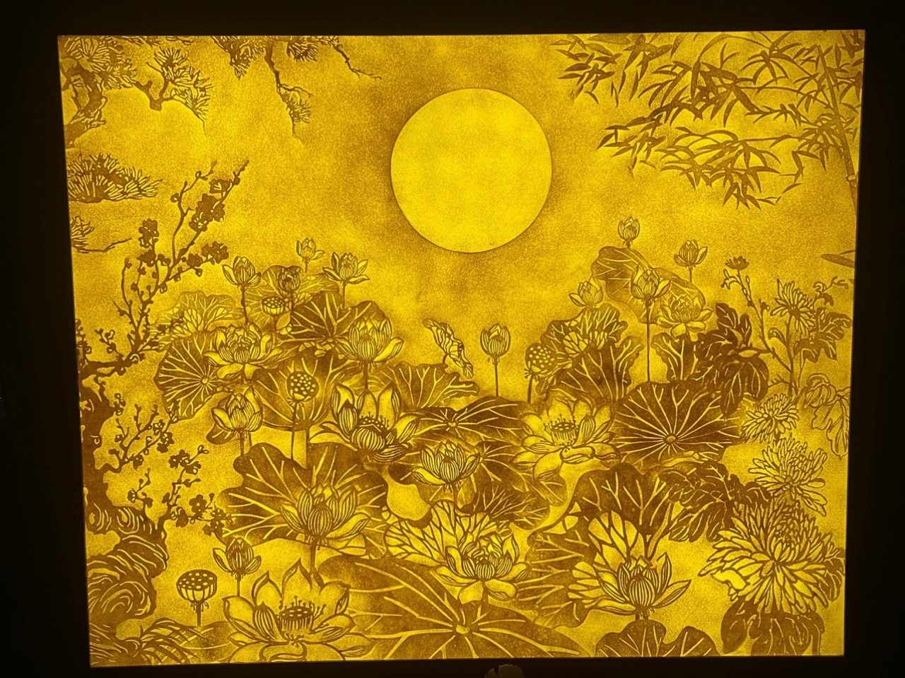 _ Chất liêu: Tranh làm từ giấy trúc thủ công, khung gỗ sồi tự nhiên