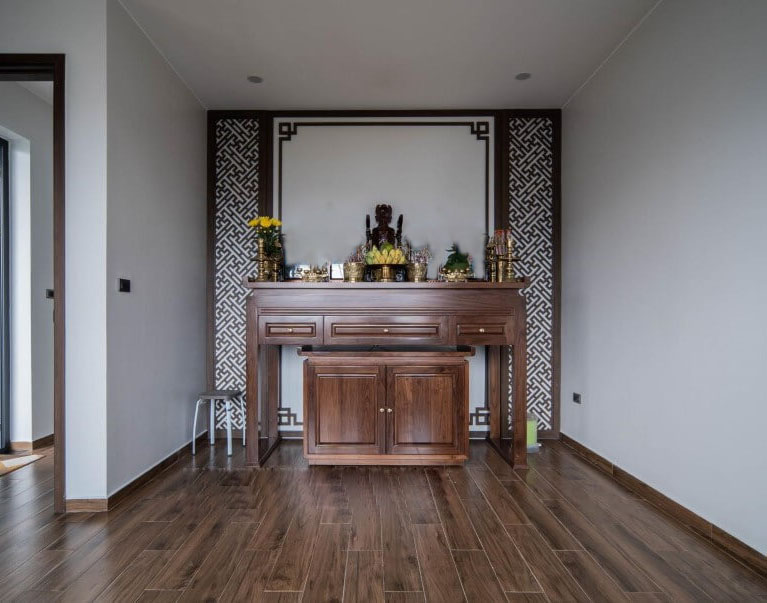 _ Đặt bàn thờ vào giữa ngôi nhà tạo thành một không gian mở, gần giếng trời, gần sân vườn và cũng là vị trí trang trọng, nghiêm túc. Không cần quá rộng, vừa đủ để bài trí là được.