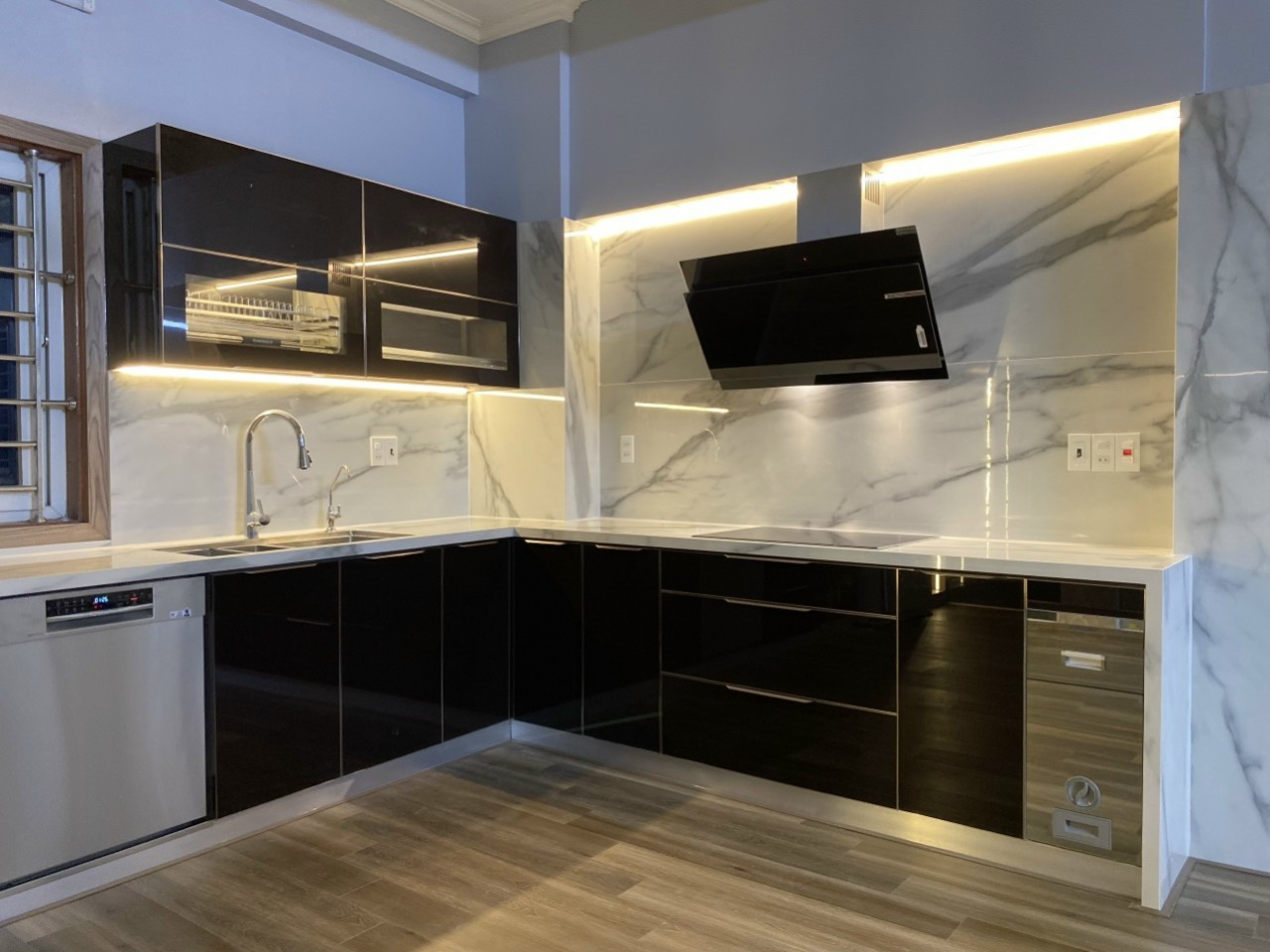 Mẫu tủ bếp chữ L gỗ công nghiệp